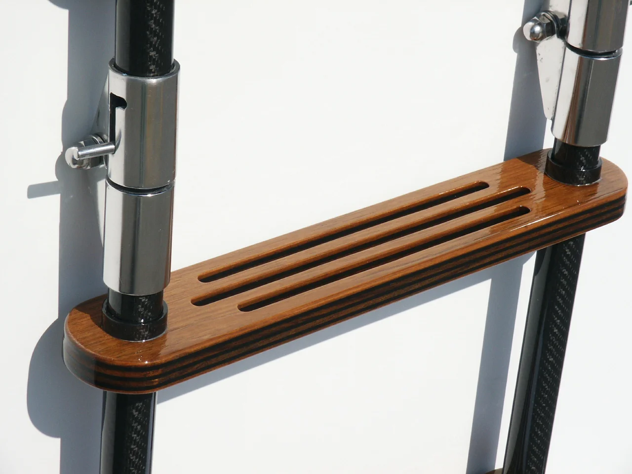 GMT has been building carbon swim ladders for years, and we have built boarding ladders for a huge variety of applications. The large ladder featured above has laminated teak treads which save weight compared to full teak, but keep a classic look. The ladder also has full height hand rails for safe and secure boarding all the way onto the yacht.