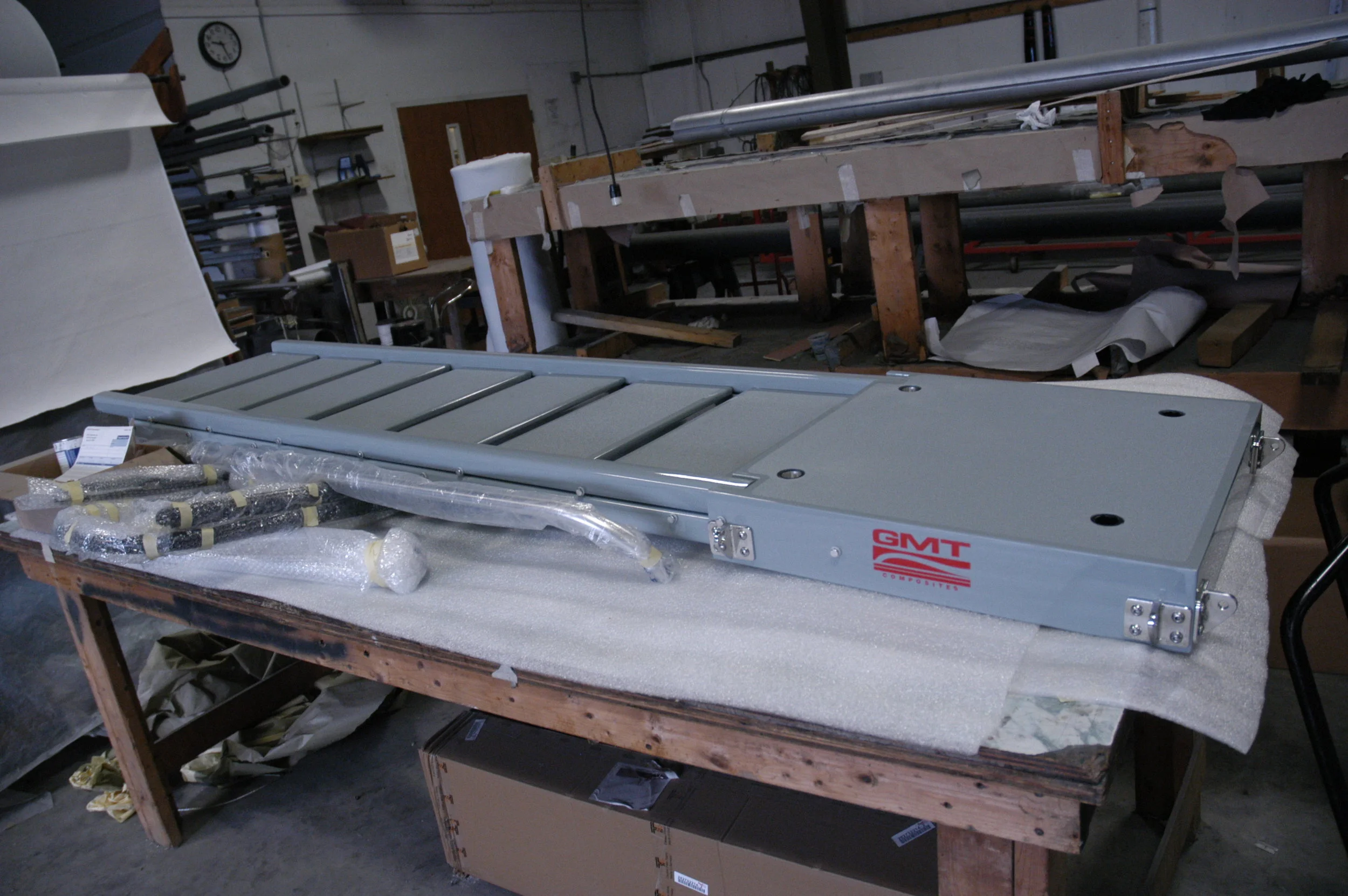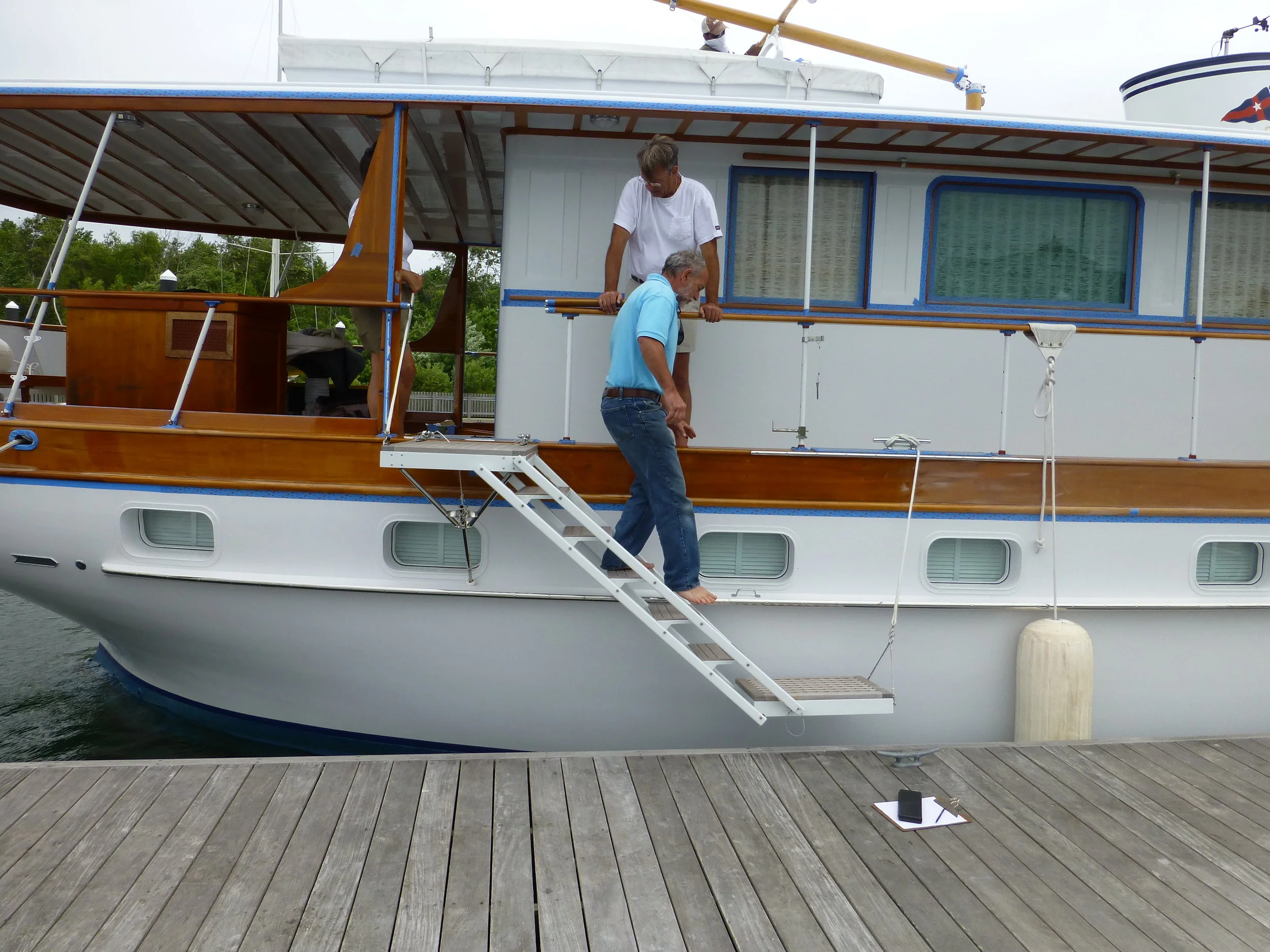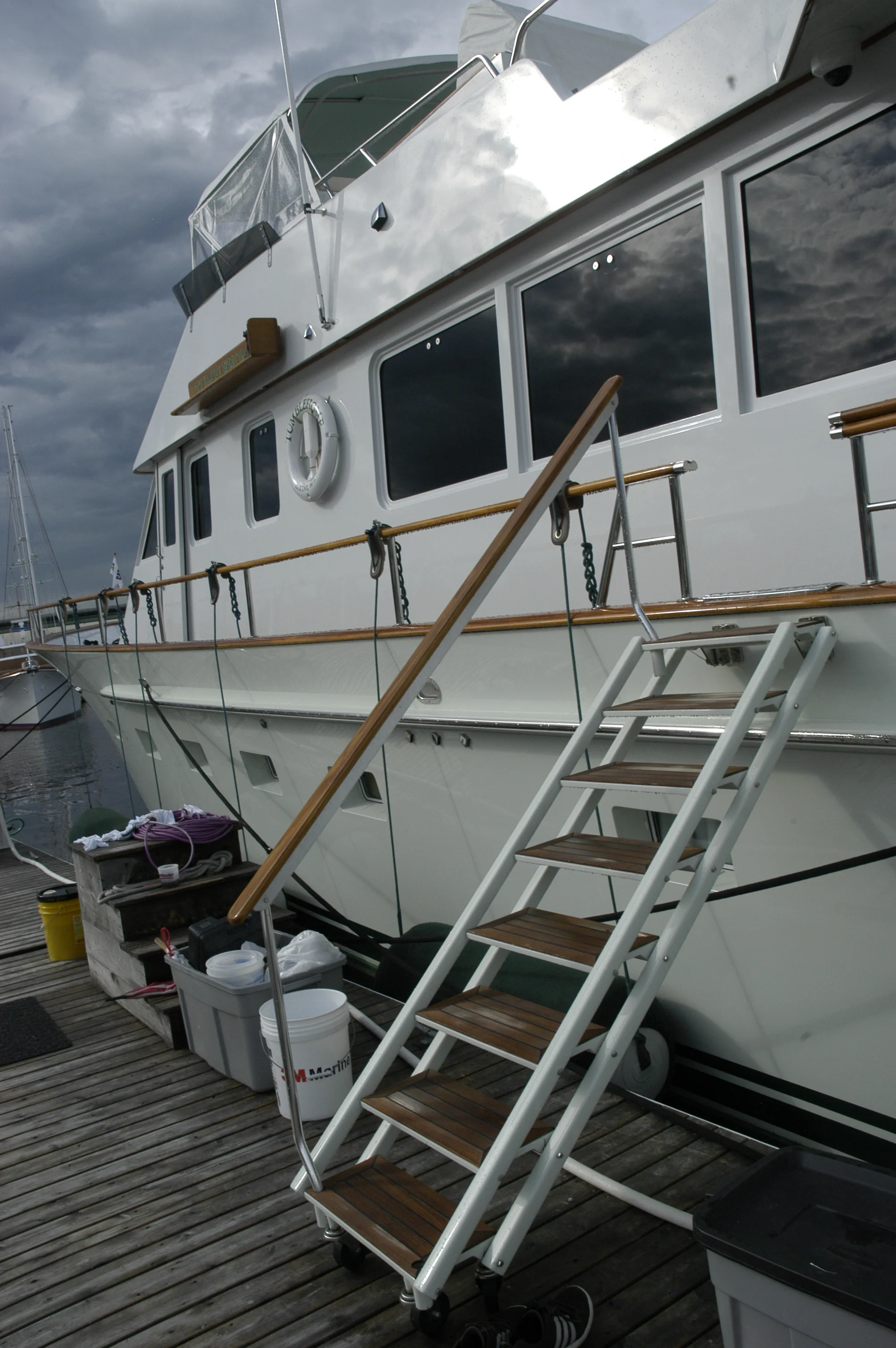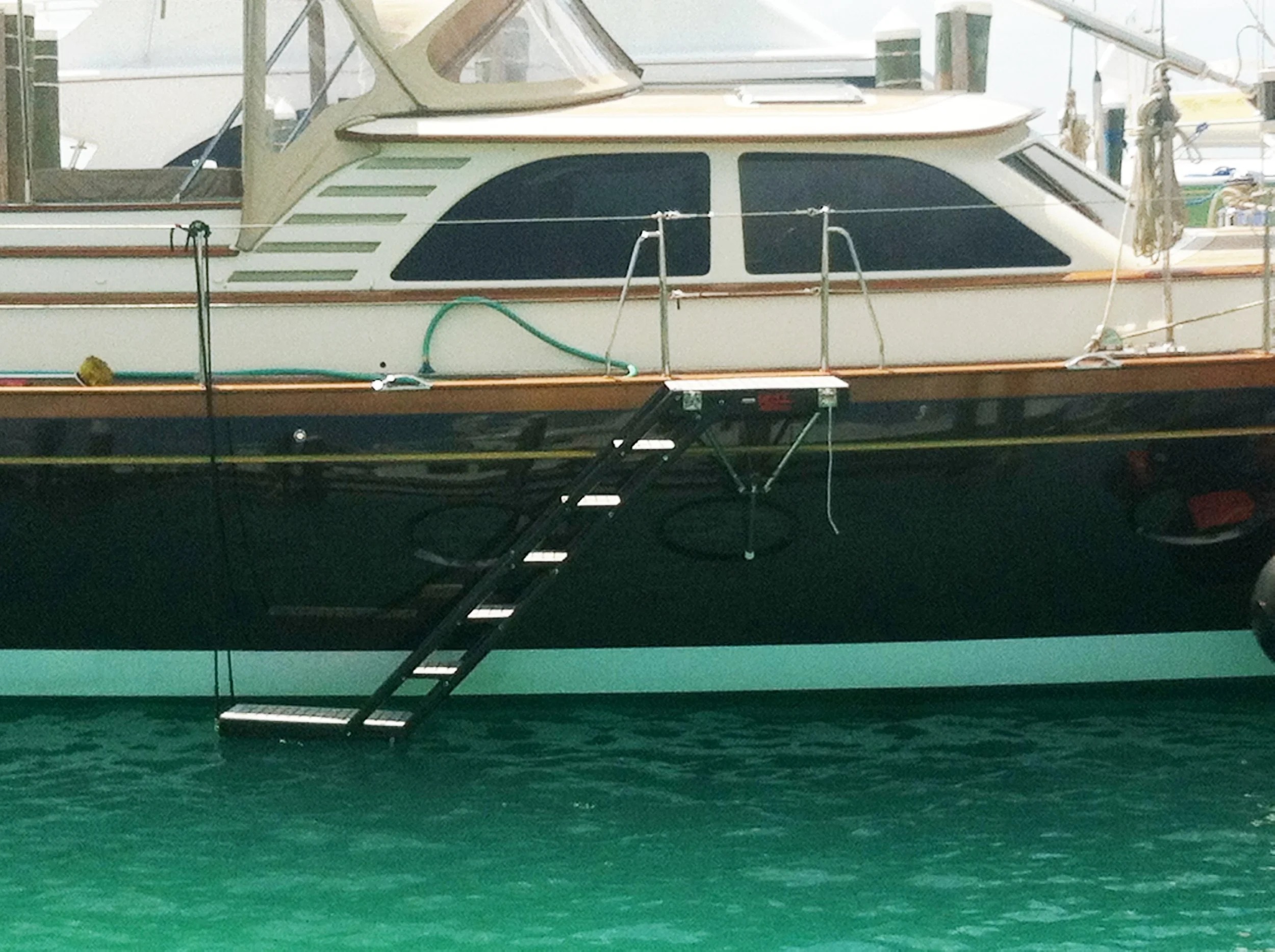 Going ashore can be risky business when tides change your leaping angle to the quay or dock, and every port has different situations. Most passerelles or boarding systems on larger yachts are heavy and are designed to be used with complex hydraulics. GMT boarding systems offer a simple and light alternative. A ten step unit with upper and lower platforms like the gray one shown on this page is 109" long, 20.5" wide, and weighs only 60lbs!